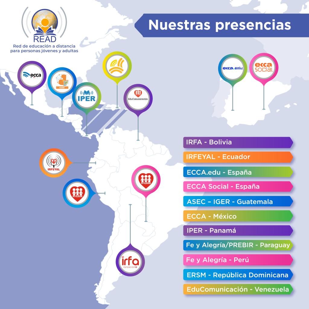 La Red Internacional de Educación a Distancia (READ) se destaca por ofrecer educación formal a personas adultas mediante una metodología flexible e innovadora basada en el sistema ECCA, conocido como “elmaestroencasa”, que combina clases en audio, materiales impresos y tutorías personalizadas. Una de sus principales fortalezas es la integración de tecnologías educativas y de comunicación en sus programas, lo que permite diversificar sus acciones y brindar acompañamiento social. Además, READ cuenta con una sólida presencia internacional en más de 10 países, adaptando su enfoque a distintas realidades culturales. Su programación radiofónica educativa de 24 horas diarias constituye otro pilar fundamental, al brindar formación, orientación y compañía continua a estudiantes y comunidades a través de medios accesibles y efectivos.